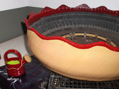 materiales: neumático de coche, tapacubo, maceta de plástico (las negras que dan en los viveros), tornillos para unir la maceta que hace de pie al tapacubo y pintura esmalte uretanado de exterior.